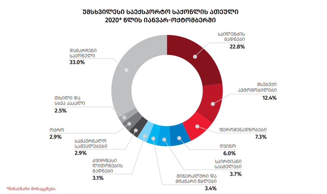რაც შეეხება 2020 წლის იანვარ-ოქტომბერში ექსპორტის განაწილებას სასაქონლო ჯგუფების მიხედვით, აქ პირველი სამეული შეადგინა სპილენძის მადნებმა და კონცენტრატებმა, მსუბუქმა ავტომობილებმა და ფეროშენადნობებმა.