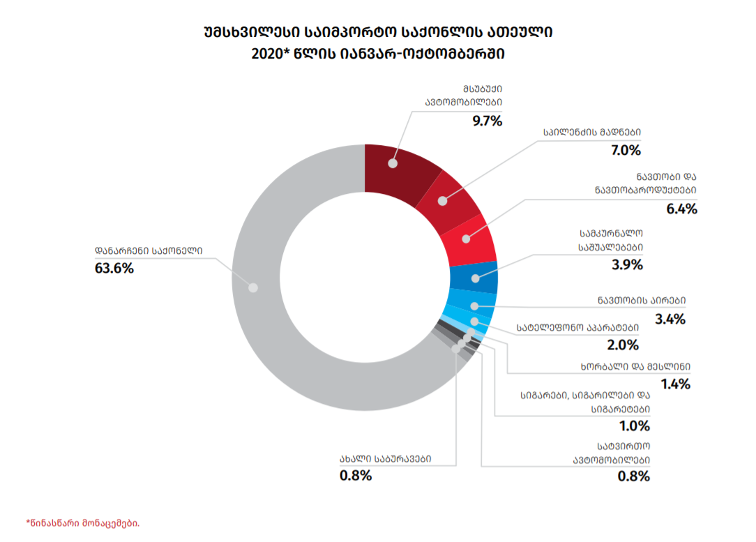 რაც შეეხება 2020 წლის იანვარ-ოქტომბერში იმპორტის განაწილებას სასაქონლო ჯგუფების მიხედვით, პირველი სამეული შეადგინა მსუბუქი ავტომობილებმა, სპილენძის მადნებმა და კონცენტრატები ნავთობი და ნავთობპროდუქტებმა.