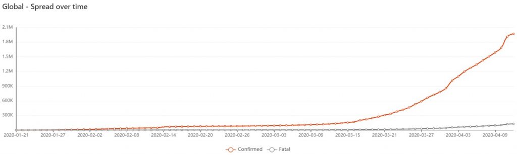 15 აპრილს კორონავირუსის გავრცელებამ ახალ მასშტაბებს მიაღწია – დღეისთვის მსოფლიოში COVID-19-ით ინფიცირების ორ მილიონზე მეტი შემთხვევაა დადასტურებული. გამოჯანმრთელდა 474,000-ზე მეტი ადამიანი. ვირუსით კი გარდაიცვალა 125,000-ზე მეტი.