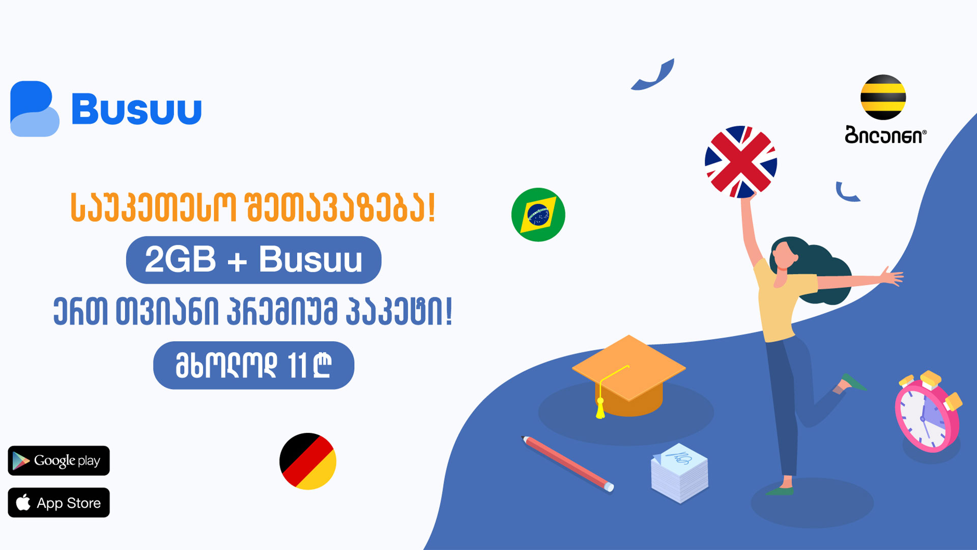 საერთაშორისო ჯგუფ „ვიონი“-ს წევრი, ბილაინი, მის მომხმარებლებს ახალ პროდუქტს სთავაზობს. მხოლოდ 11 ლარად თვეში, ბილაინის აბონენტებს შესაძლებლობა აქვთ ისარგებლონ 2GB მობილური ინტერნეტითა და უცხო ენების შესწავლის პლატფორმა Busuu-ს პრემიუმ პაკეტით.