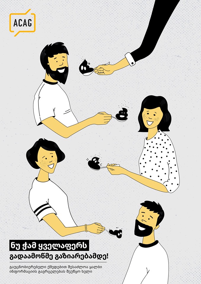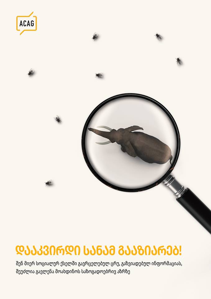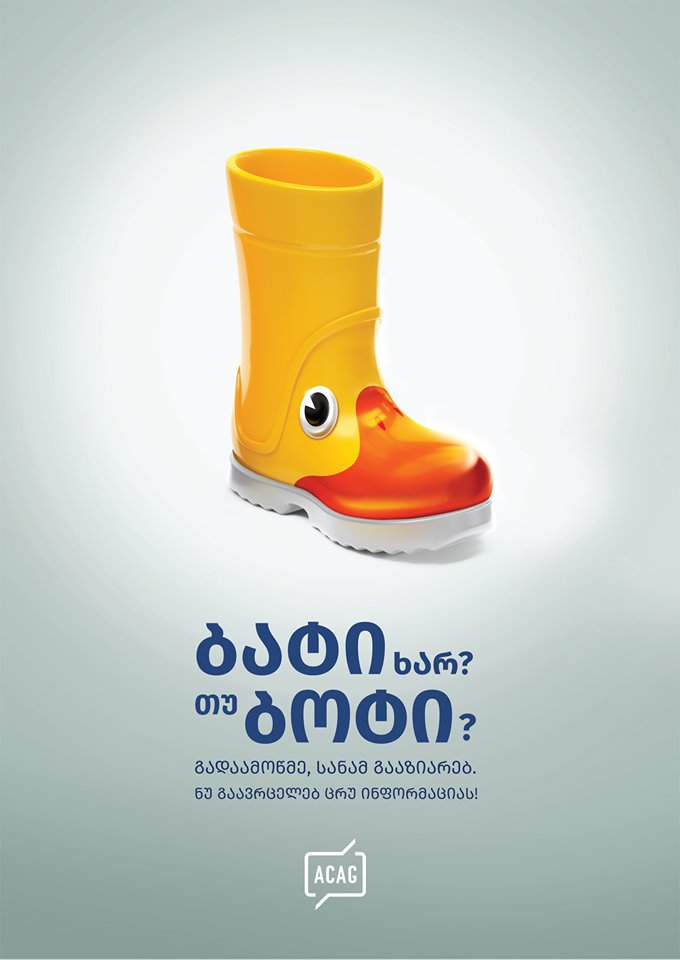 საქართველოს საკომუნიკაციო სააგენტოების ასოციაცია [ACAG] საქართველოში მოქმედ წამყვან სარეკლამო სააგენტოებს აერთიანებს. ცოტა ხნის წინ კი მან პრინტ კონკურსი დააანონსა, რომლის მთავარი მიზანი იყო, სააგენტოებს შეექმნათ საკომუნიკაციო მესიჯის მატარებელი პოსტერი, რომელიც ინტერნეტ მომხმარებელს კრიტიკულად განაწყობს – სოც.ქსელებში მოძიებული ინფორმაციების მიმართ, (ანუ გაუჩნდება კითხვები) აღმოაჩენინებს ყალბ ინფორმაციას ანუ ე.წ „Fake News-ს“ და გადააფიქრებინებს მის გავრცელება-გაზიარებას.