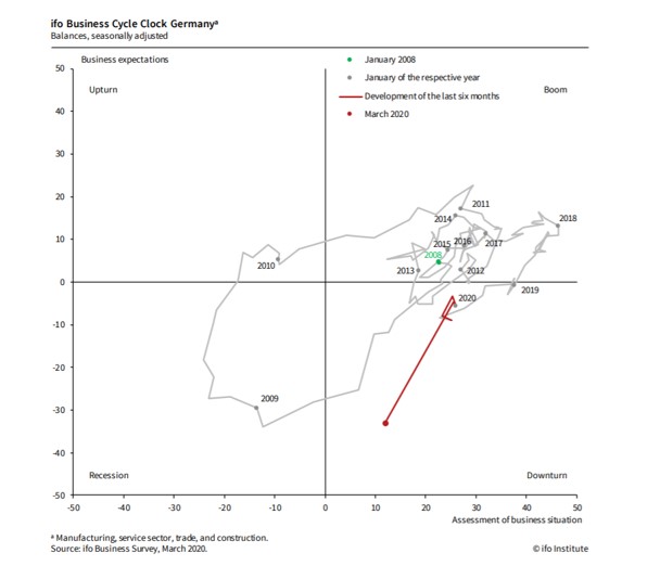 გერმანიის ეკონომიკა, რომელიც ამავდროულად ევროპის ყველაზე დიდი ეკონომიკაა, კორონავირუსით გამოწვეული კრიზისის გამო შეიძლება 20%-ით შემცირდეს, აცხადებს IFO-ს კვლევითი ინსტიტუტის ეკონომისტი. პროგნოზი ეყრდნობა გერმანიის ეკონომიკური განვითარების მნიშვნელოვან წინასწარ მაჩვენებელს – ბიზნესის კლიმატის ინდექსს.