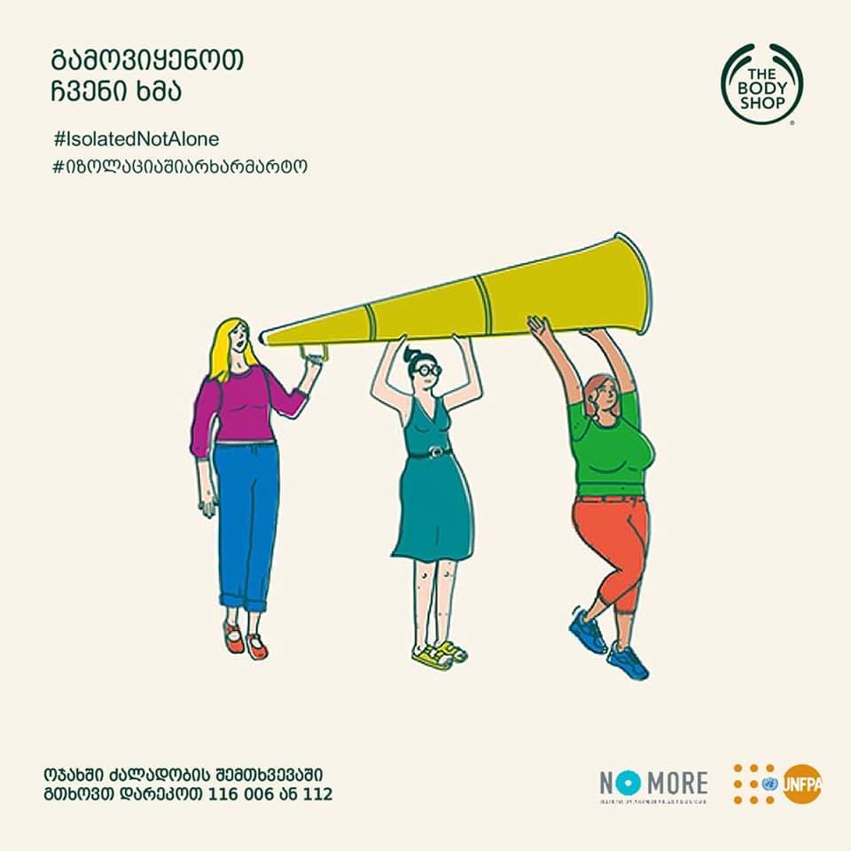 ბოდი შოპი და საერთაშორისო ორგანიზაცია NO MORE იწყებენ კამპანიას – „Isolated Not Alone. „კამპანიის მიზანი არის აამაღლოს ცნობიერება დამალული საფრთხის შესახებ, რომელიც მოსდევს იძულებით თვითიზოლაციას, მოახდინოს ხალხის მობილიზება იმისათვის, რომ მიაწვდინონ ხმა იმათ ვინც არიან ოჯახური ძალადობის რისკის ქვეშ.