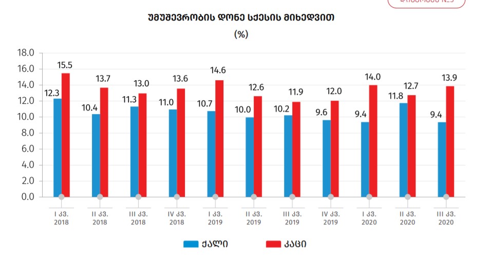 რაც შეეხება უმუშევრობის დონეს სქესის მიხედვით, ის მამაკაცებში კვლავ მაღალია. 2020 წლის III კვარტალში, წინა წლის შესაბამის პერიოდთან შედარებით, აღნიშნული მაჩვენებელი ქალებში 0.8 პროცენტული პუნქტით შემცირდა, ხოლო კაცებში 2.0 პროცენტული პუნქტით გაიზარდა.