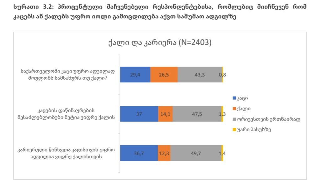 ამავდროულად, ქალების 85%-ი და კაცთა 58%-ი აცხადებს, რომ ქალებს უწევთ ბევრად მეტი ბარიერის გადალახვა მათი პროფესიულ განვითარების გზაზე, ვიდრე კაცებს. ქალები აქტიური ეკონომიკური და საზოგადოებრივი ცხოვრების ქონის მთავარ შემაფერხებელ ფაქტორად, ოჯახურ პასუხისმგებლობებს ასახელებენ. გამოკითხულთა უმეტესობა ფიქრობს, რომ საზოგადოებრივ ცხოვრებაში მონაწილეობის მიღებისთვის კაცები და ქალები თანაბრად კომპეტენტურები არიან. თუმცა, ამას უფრო მეტად ქალები ფიქრობენ ვიდრე კაცები. 2013 წელთან შედარებით, როდესაც გამოკითხულთა მხოლოდ 33% -მა თქვა, რომ ქალებს და კაცებს ერთნაირი შესაძლებლობები აქვთ ბიზნესის ლიდერობაში, 2019 წელს, გამოკითხულთა 55% ფიქრობს, რომ როგორც ქალებს, ისე კაცებს აქვთ თანაბარი შესაძლებლობები იყვნენ ბიზნეს-ლიდერები.